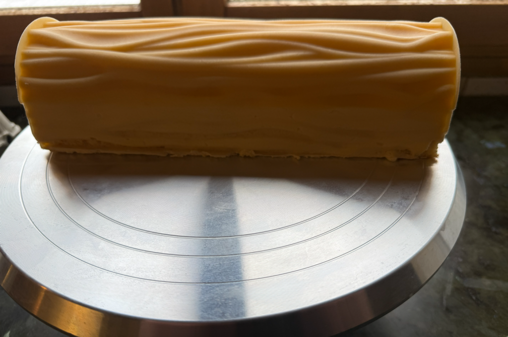 POUR LE CLEMENTINE CURD : a - Portez tous vos ingrédients à ébullition sauf le beurre pommade, en fouettant en continu, et sur feu doux. b - En parallèle, réhydratez la gélatine dans l'eau froide et incorporez la au clémentine curd. d - Lorsque votre préparation est refroidie incorporez votre beurre pommade au fouet ou à la girafe ! c - Dans le moule silicone de votre bûche, verser la moitié de votre clémentine curd, l'autre moitié est pour la mousse à la clémentine. Placez la au congélateur ! POUR LA MOUSSE A LA CLEMENTINE : a - Monter sa crème chantilly à l'aide du fouet de votre robot, et l'incorporer à la moitié de votre clémentine curd. b - Versez votre mousse de clémentine sur le clémentine curd dans le moule à bûche en silicone, puis finir avec un rectangle de génoise ! Replacer votre bûche montée au congélateur ! Je vous montre une fois congelé ce que ça donne, on y voit le clémentine curd en orange foncé et la mousse en clair : J'ai un moule Silikomart avec un tapis qui donne cet aspect de bois... vous pouvez à ce stade ne pas faire de meringue italienne mais juste un glaçage miroir ! J'ai créée cette bûche pour ma soeur qui adore la meringue italienne alors je lui ai fait sa meringue italienne !