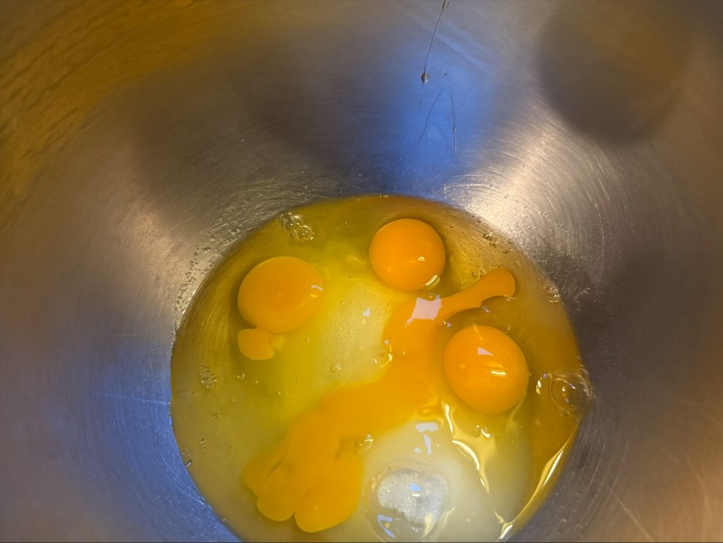 b - Pendant que le sucre monte en température, fouettez à vitesse moyenne les blancs afin qu'ils deviennent mousseux !