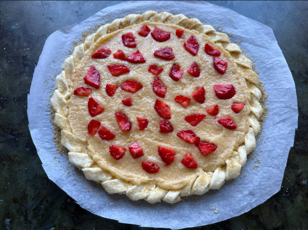 Ma pâte semi-feuilletée a - A l'aide de la feuille de votre robot, mélangez la farine et le beurre mou, puis, une fois votre sablage, ajoutez y vos petits-suisses. Farinez votre plan de travail et donnez 3 tours de pliages, comme pour la pâte feuilletée ! Laissez votre pâte reposer 1h dans un film au frais ! Préchauffez votre four à 170 °C chaleur tournant. b - Etalez votre pâte sur une feuille de papier sulfurisé sur lequel vous aurez mis du sucre de cassonade pour bien caraméliser le dessous et aussi pour le rendre ultra croustillant ! c - Prenez ensuite un grand cercle, puis un autre cercle plus petit pour faire les bords comme sur ma photo ! d - Piquez votre pâte puis y déposer votre crème d'amande et des morceaux de fraises.![]()