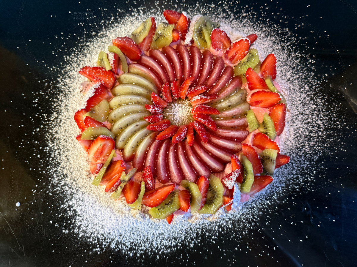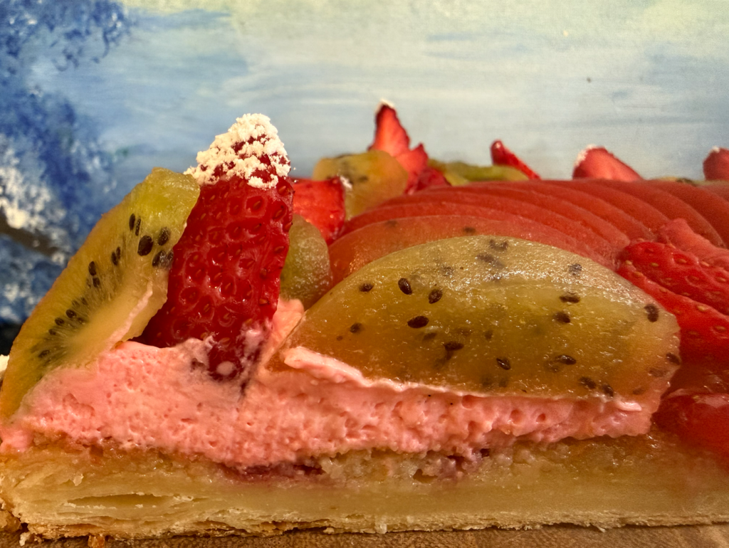 a - Mettre votre chantilly dans une poche à douille, avec une grosse douille et pochez votre crème sur votre fond de tarte ! b - Déposez ensuite la rosace kiwi&fraise au centre, puis finaliser avec des fraises tout autour ainsi que des tranches de kiwi. Le reste en images :![]()
